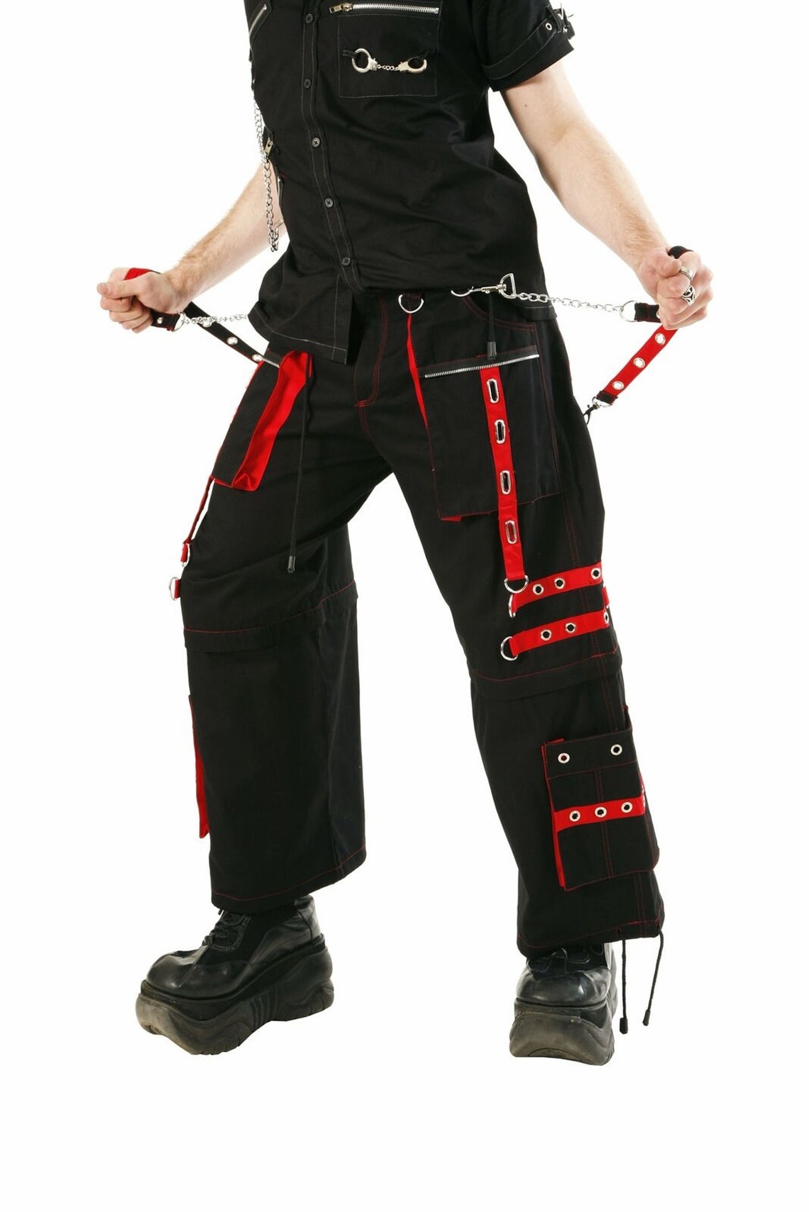 Men bondage pant punk rock cyber jean techno Goth pant Accept no imitations! From the originator of all things Dark Street, these two-toned Tripps zip off into shorts and feature removable straps, D-rings, and deep pockets. 100% Cotton. The model is wearing size Medium. Hand wash cold. Lay flat to dry.