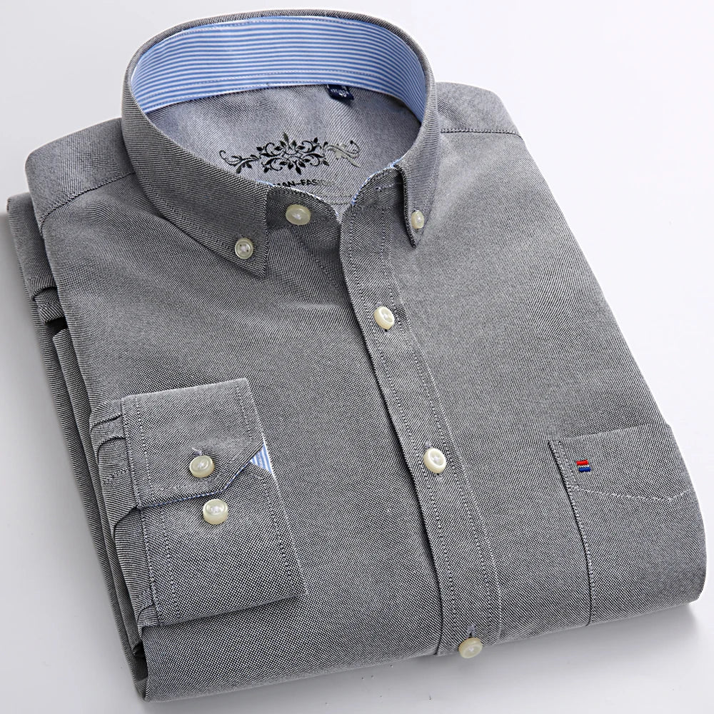Men's Fashion Long Sleeve Solid Oxford Shirt Single Patch Pocket Standard-fit Button-down Collar Shirts