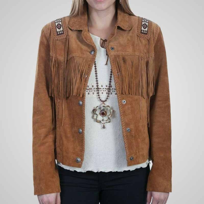 Women’s Western Suede Fringe Jacket with Beaded Detail – Brown Cowgirl Vintage Style