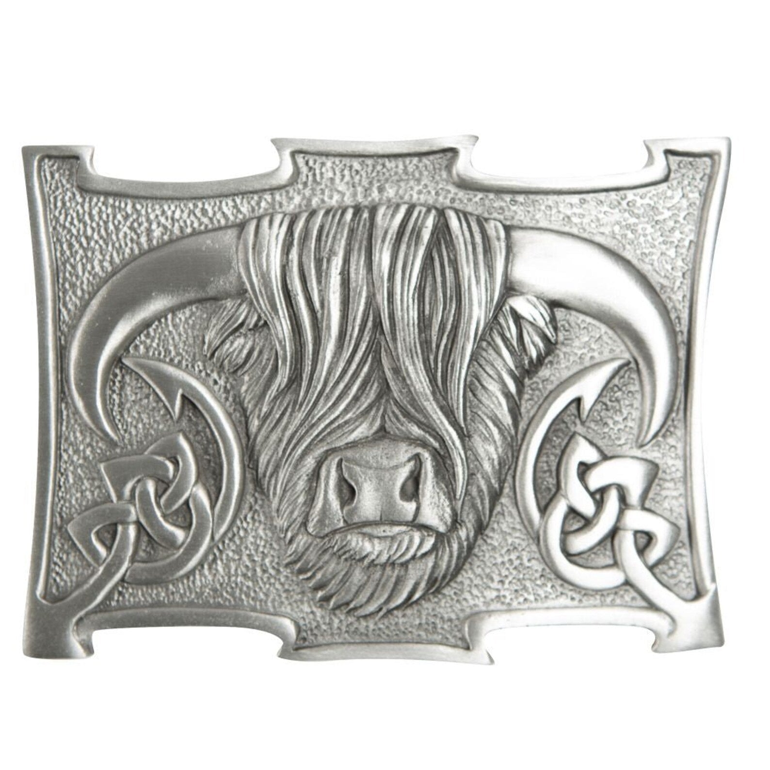 This popular kilt belt buckle shows a detailed Highland Cow design in a polished finish