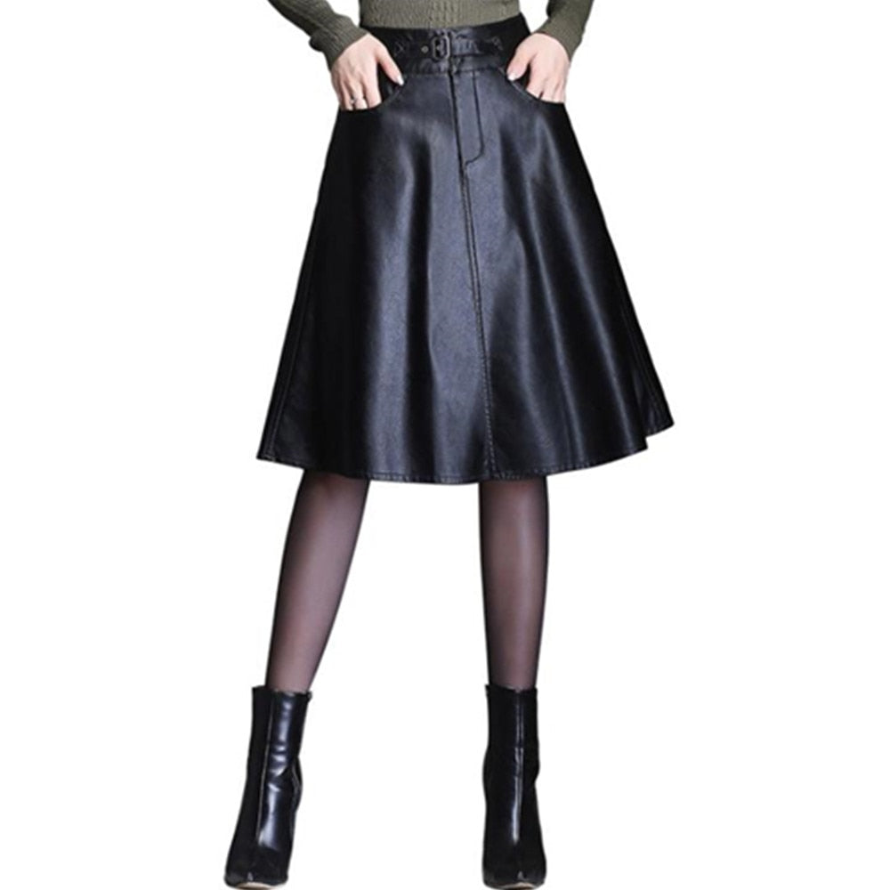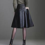 Title: High Waist Pockets Leather Skirts Womens Elegant Office Midi Pleated PU Skirt Female Casual A line Flare Swing Umbrella Skirt