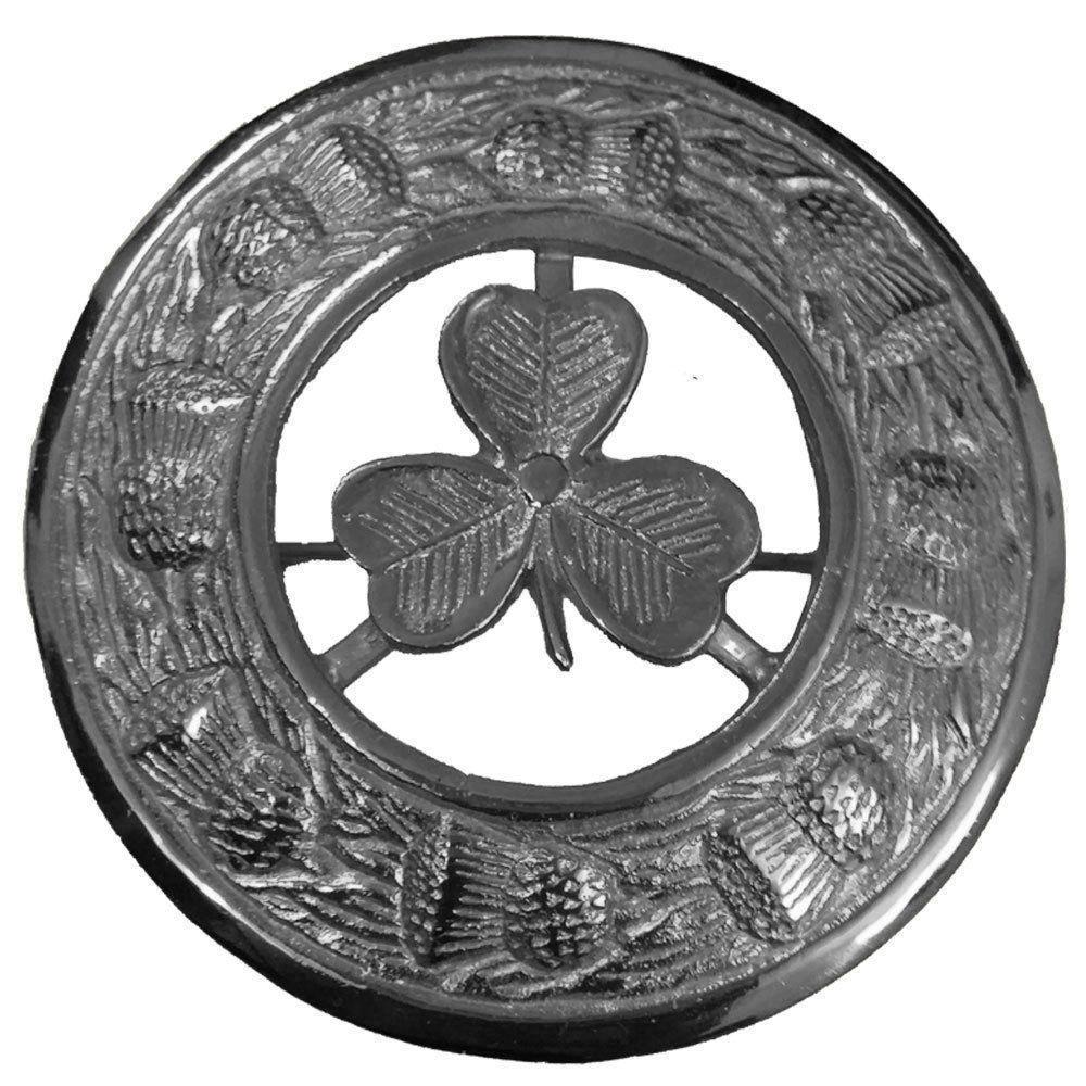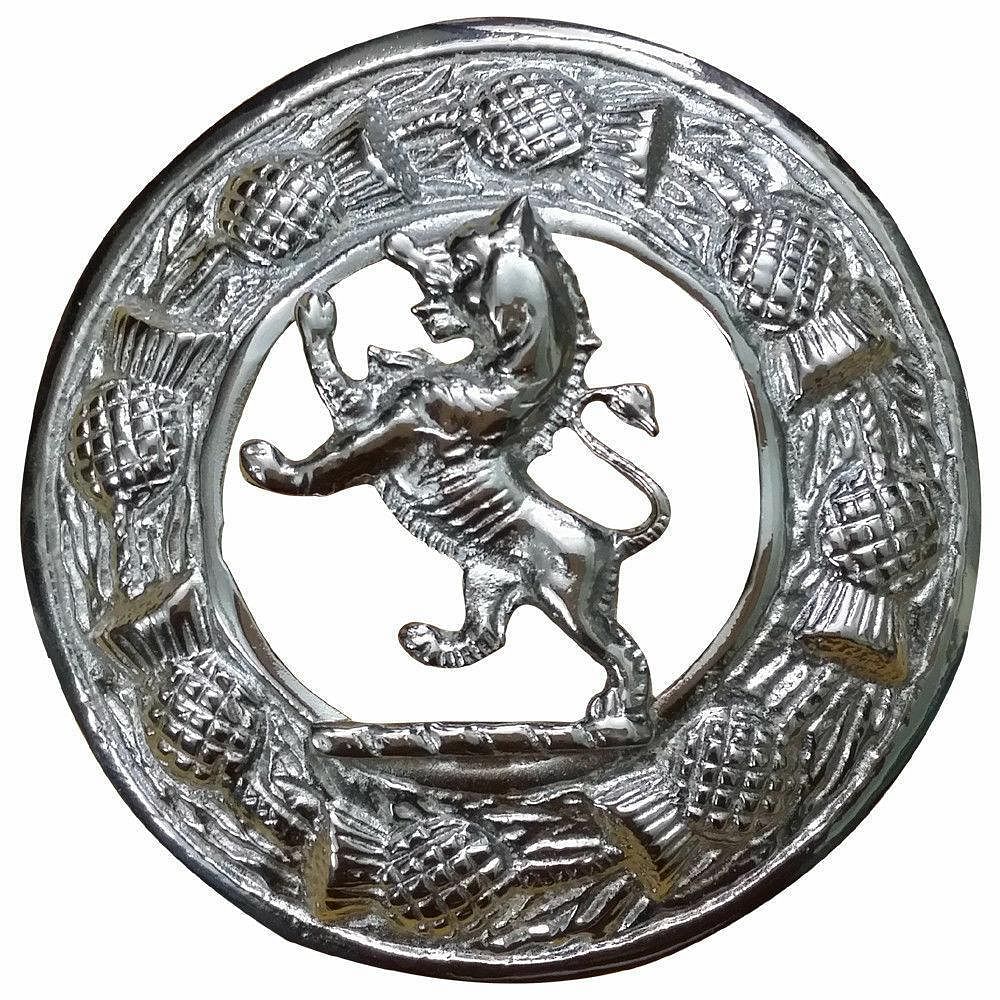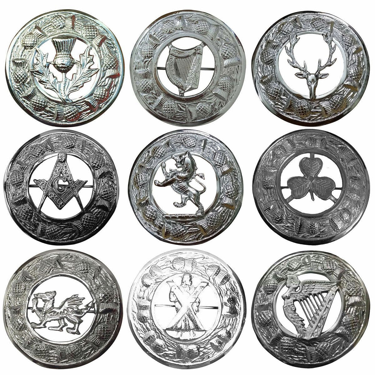 Scottish & Highland Kilt Fly Plaid Brooch Thistle Work Design with Various Badges and High Quality Chrome/Silver Finish