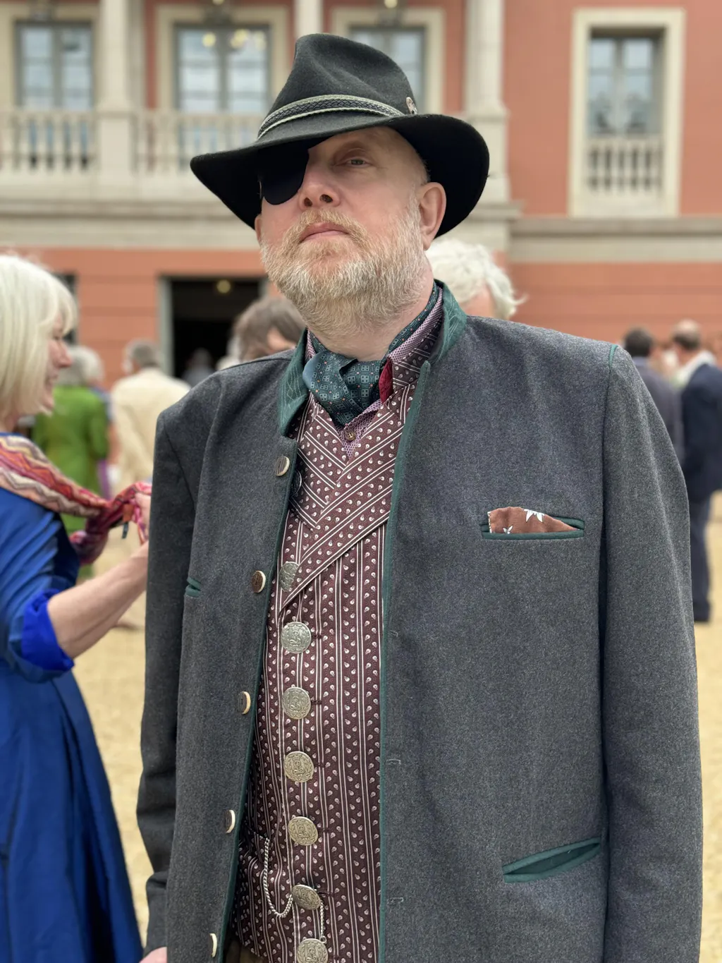 Charcoal Grey Bavarian jacket offers a subtle charm, perfectly complementing any color of lederhosen. For a more casual look, pair it with leather pants or denim jeans. The dark green pocket edging and collar add a touch of color, enhancing the jacket's sophisticated appearance.